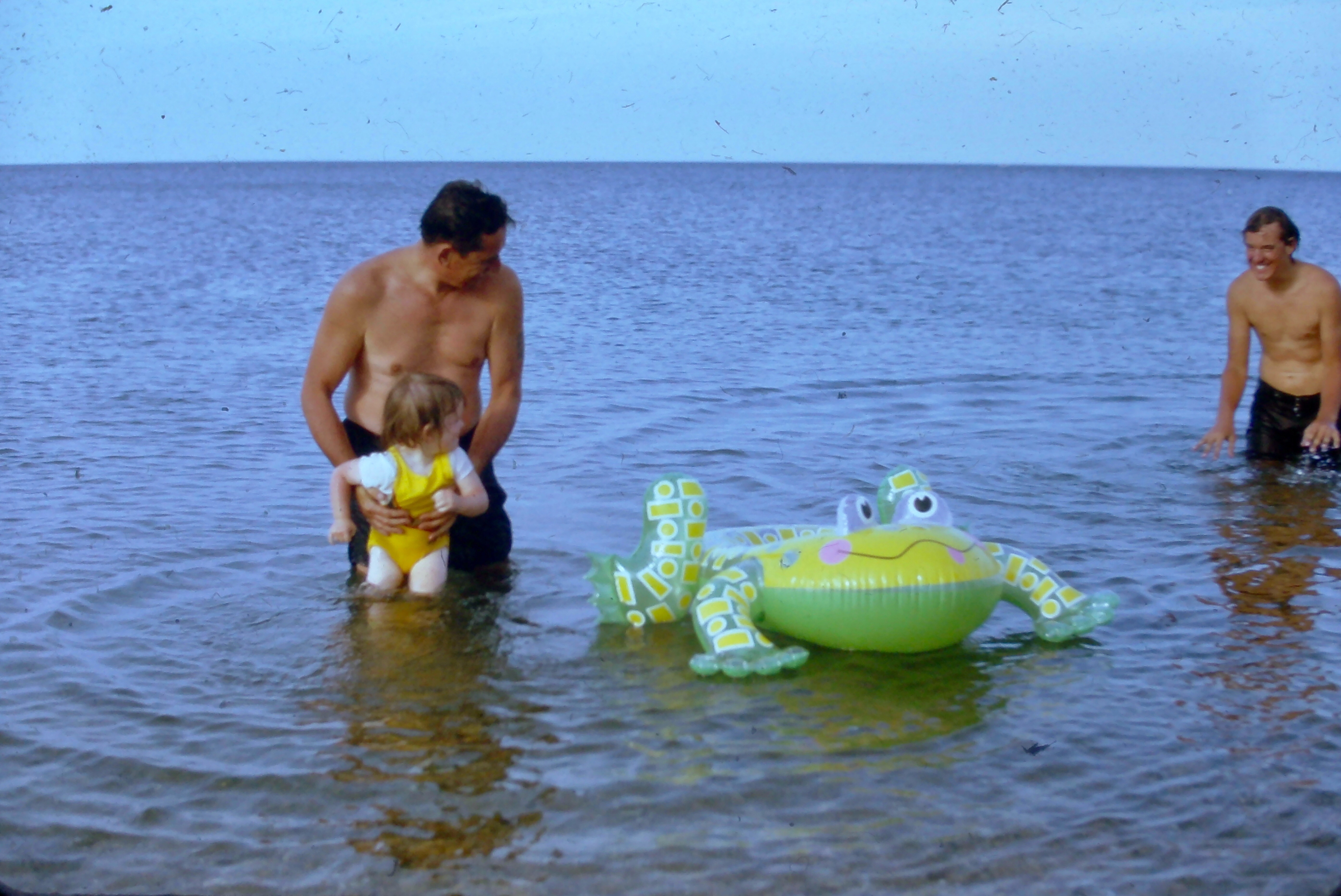 My grandfather is holding me and going to put me in the frog raft… my uncle was playing shark and grabbing my legs lol … so I am watching him lol