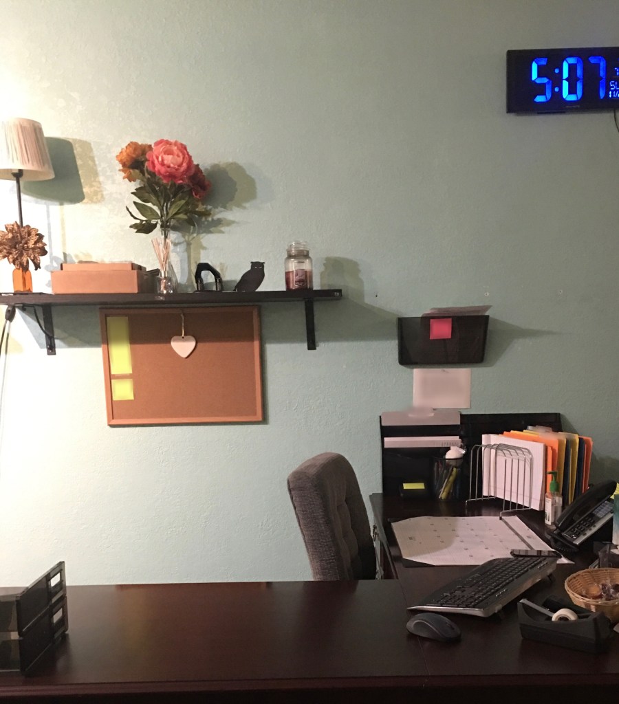 They make a big deal about people’s desks because they say it shows who they are – this does not show me – this is temporary lol … I don’t know what decorations I want yet – these are fine and homey for now ❤️