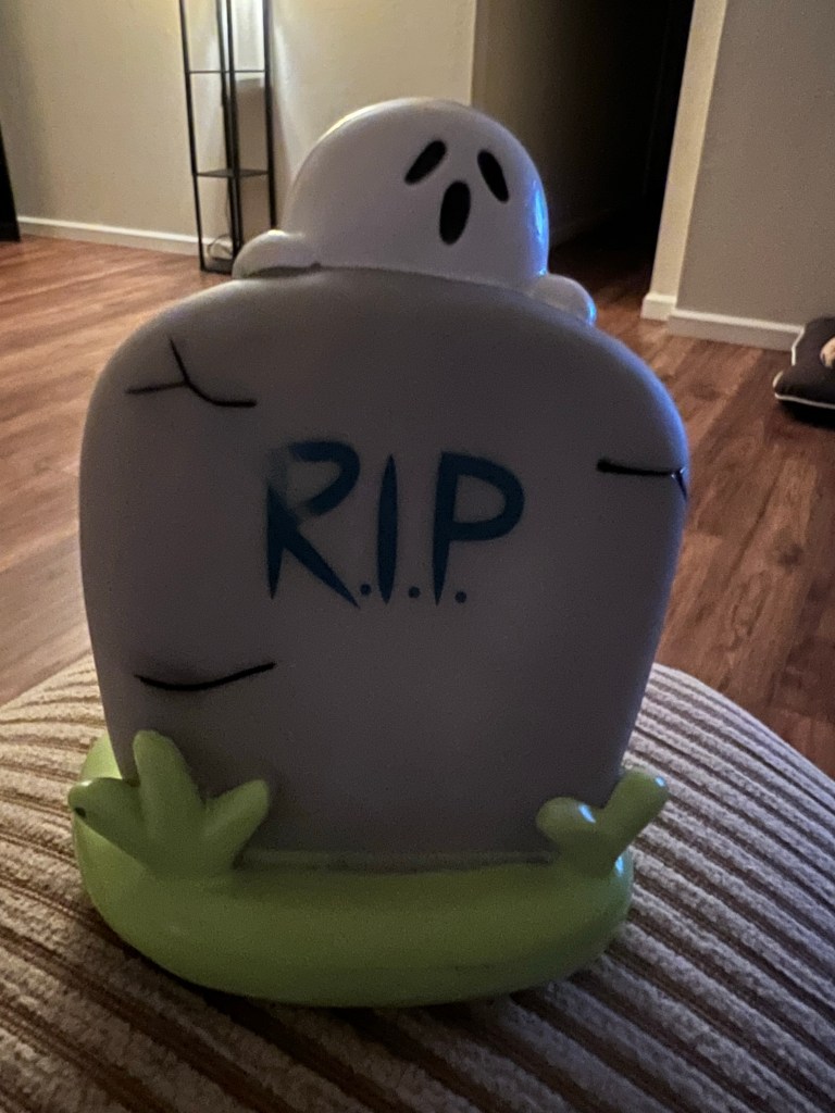 He has all furry little play things … today I bought him this adorable little ghost 👻… behind a tombstone that says RIP 🪦 … is all vinyl type toy? It squeaks and is supposed to be enjoyable for chewers ?? It’s got good squeak to it – I was sure he would love it??