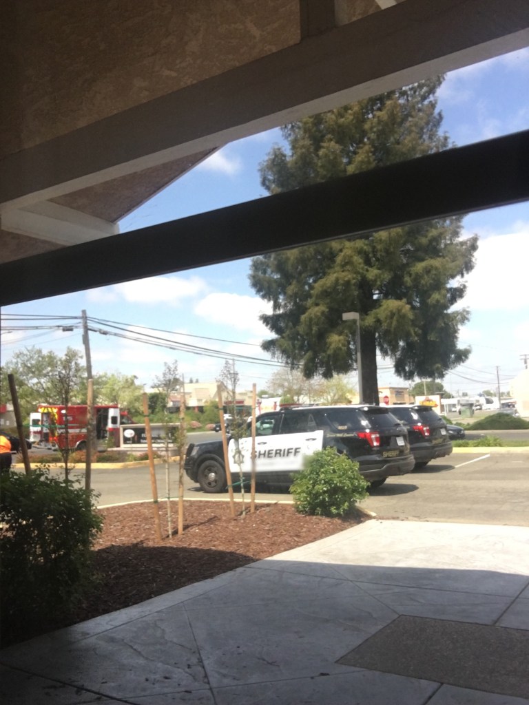I see several sheriffs pull up – two out front here and several to the side, plus a fire truck and then ambulance 😳